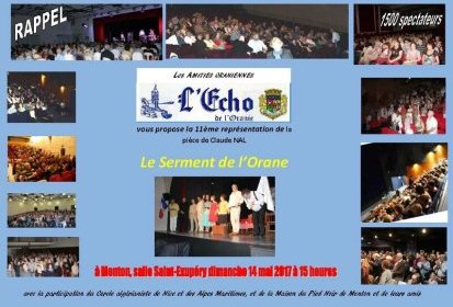 Le Serment de l’Orane à Menton - Salle Saint-Exupéry dimanche 14 mai 2017 à 15 heures.